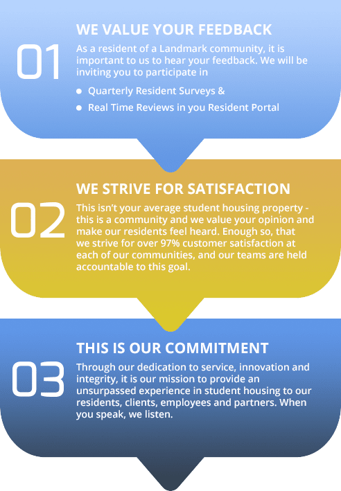 YSWL is a company-wide endeavor to show Landmark’s commitment to industry-leading resident satisfaction. Landmark provides a forum for soliciting feedback from residents through quarterly resident satisfaction surveys, real-time reviews through the resident portal, and our open door policy of welcoming comments and constructive criticism. Our improvement in resident satisfaction is not possible without feedback from our residents and parents. For that reason, when ‘You Speak, We Listen’ and treat your feedback as an opportunity to grow.